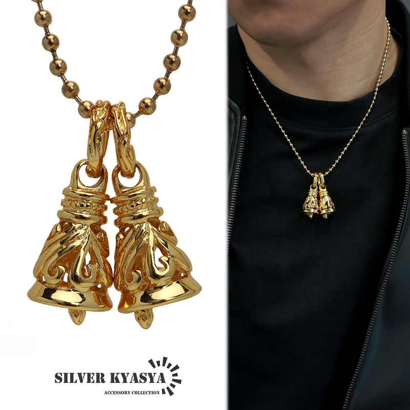 ステンレス ツインベルネックレス 唐草 ダブルクレーンベル ネックレス ゴールド 18k gp アラベスク ボールチェーン