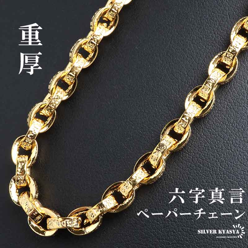 18k 金 仕上げ 梵字 ペーパーチェーンネックレス 六字真言ネックレス 金色 幅5mm 重厚感 メンズ チェーンネックレス