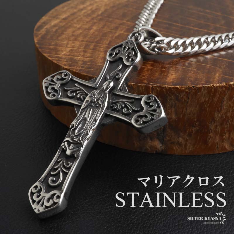 ステンレス マリアクロスネックレス ごつめ 十字架 ペンダントネックレス メンズネックレス シルバー ダブル喜平チェーン 6面カット 男性 金アレ対応