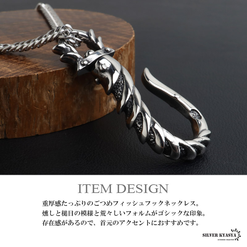 重厚感たっぷりのごつめフィッシュフックネックレス。燻しと槌目の模様と荒々しいフォルムがゴシックな印象。存在感があるので、首元のアクセントにおすすめです。