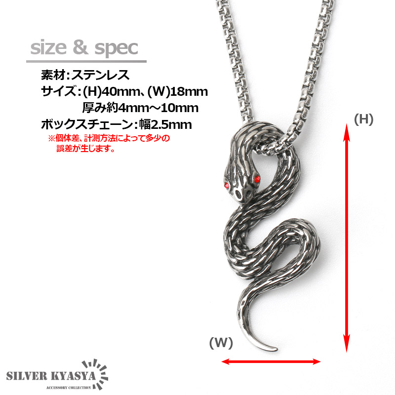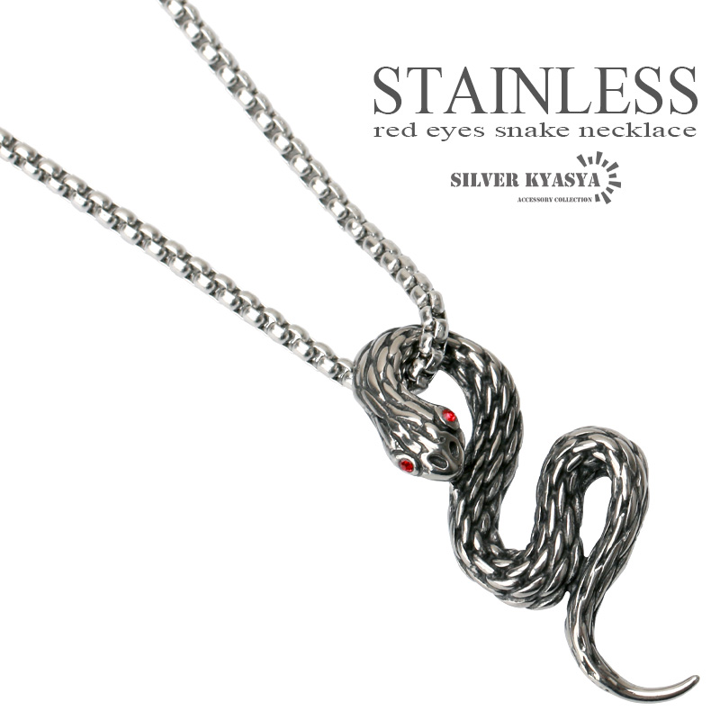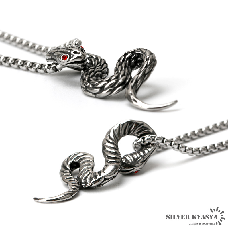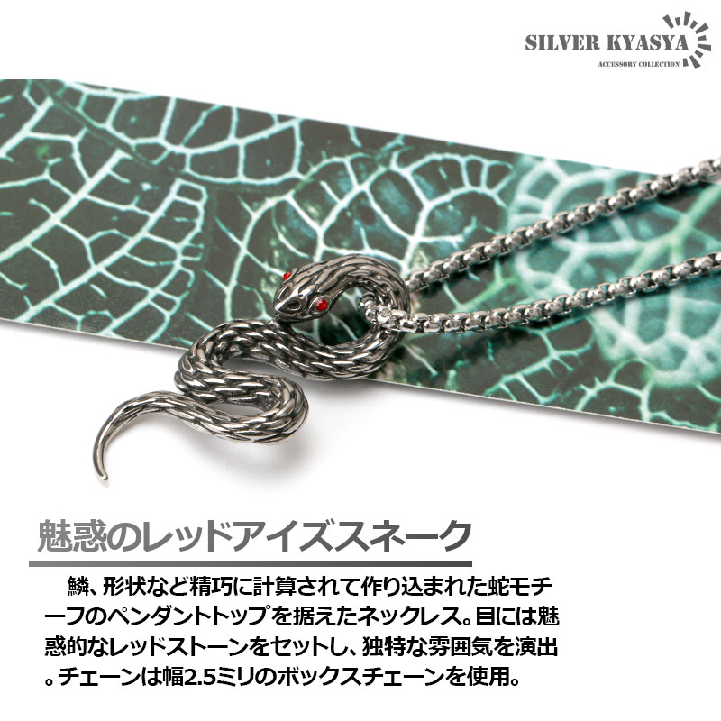 鱗、形状など精巧に計算されて作り込まれた蛇モチーフのペンダントトップを据えたネックレス。目には魅惑的なレッドストーンをセットし、独特な雰囲気を演出。胸元のアクセントに最適の出来栄え。チェーンは幅2.5ミリのボックスチェーンを使用。