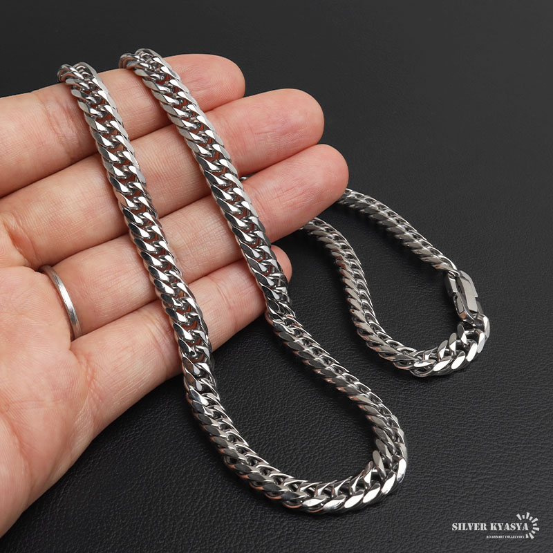 密度が濃く圧倒的な存在感が人気のダブル喜平ネックレス。6面カットの繊細な光の反射が美しいチェーンアイテムです。ステンレス製なのでつけっぱなしでも問題ございません。チェーンの長さは全3サイズからお選びいただけます。