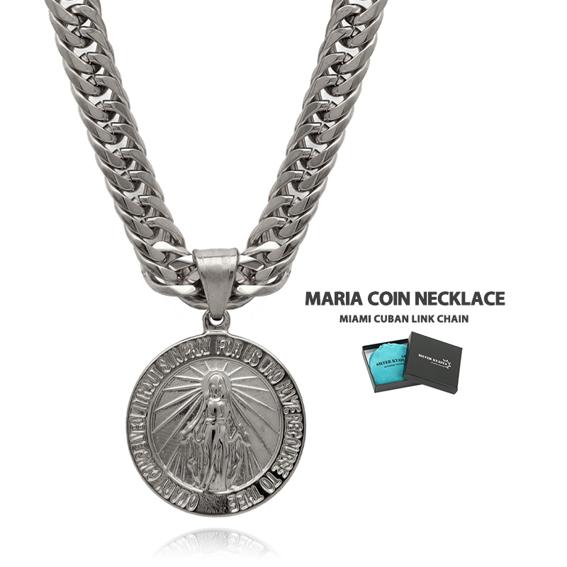 正円形のマリアコインのトップとダブル喜平チェーンをセットした存在感たっぷりのアイテム。不思議なメダイと呼ばれ古くから親しまれている、アクセサリーの定番アイテムです。