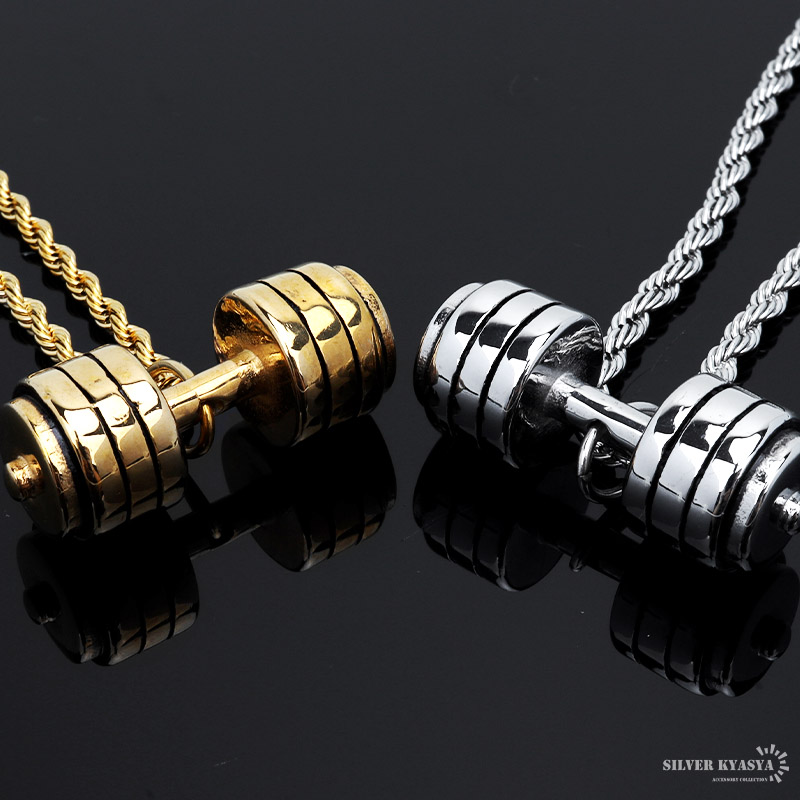 重量感・重厚感あふれる、まるで本物のような存在感のダンベルモチーフのトップを据えたネックレス。チェーンはユニークなロープチェーンをセット。ゴールド/シルバーの2カラー。