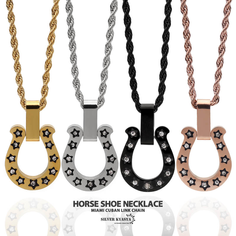 定番人気のホースシュー(馬蹄)に、星をセットしたネックレス。チェーンには、立体感のあるロープタイプを使用。4カラー展開。