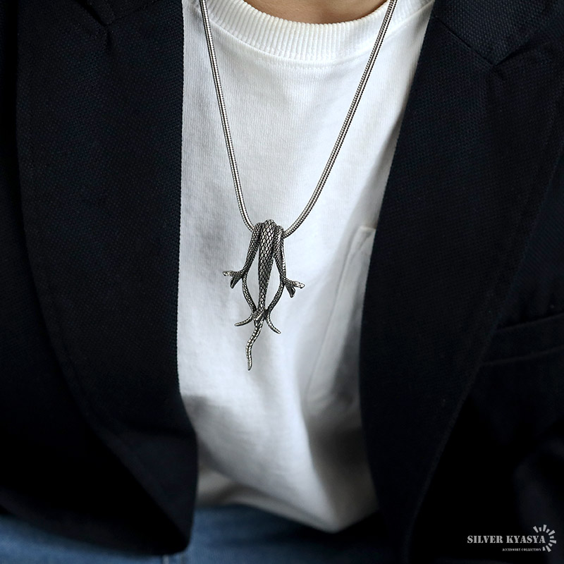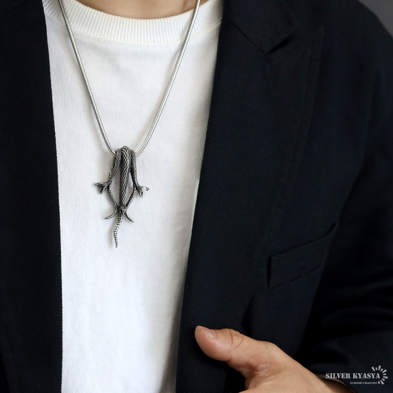 鱗までユニークに表現された蛇をトップに据えたスネークネックレス。まるで生きてるようなデザインがカッコいいアイテム。