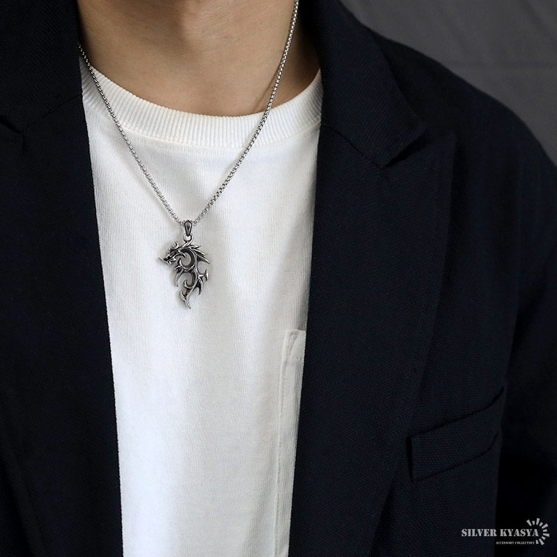 スタイリッシュに表現された龍をトップに据えたドラゴンネックレス。炎をまとっているようなクールなデザインがワンポイトのアイテム。
