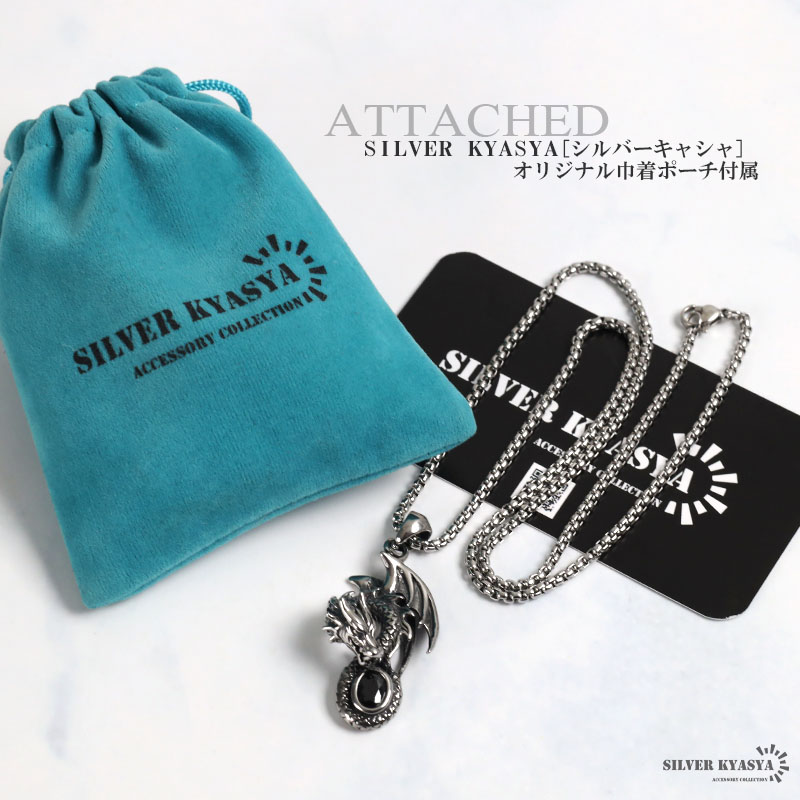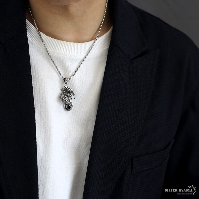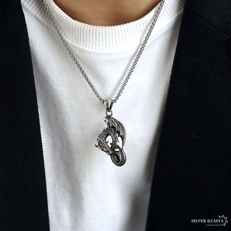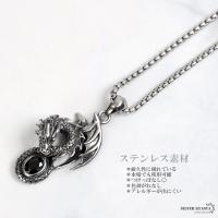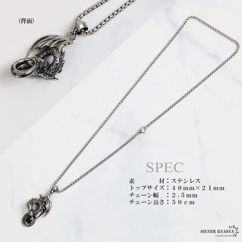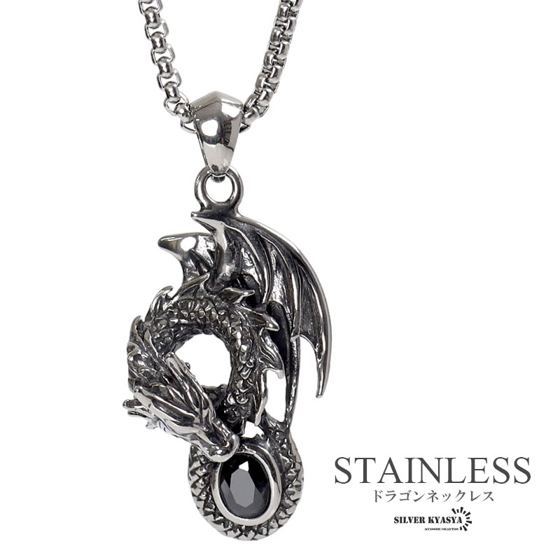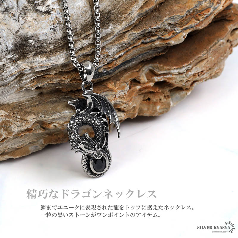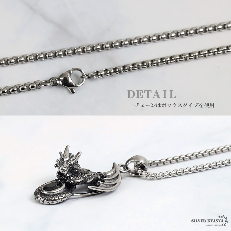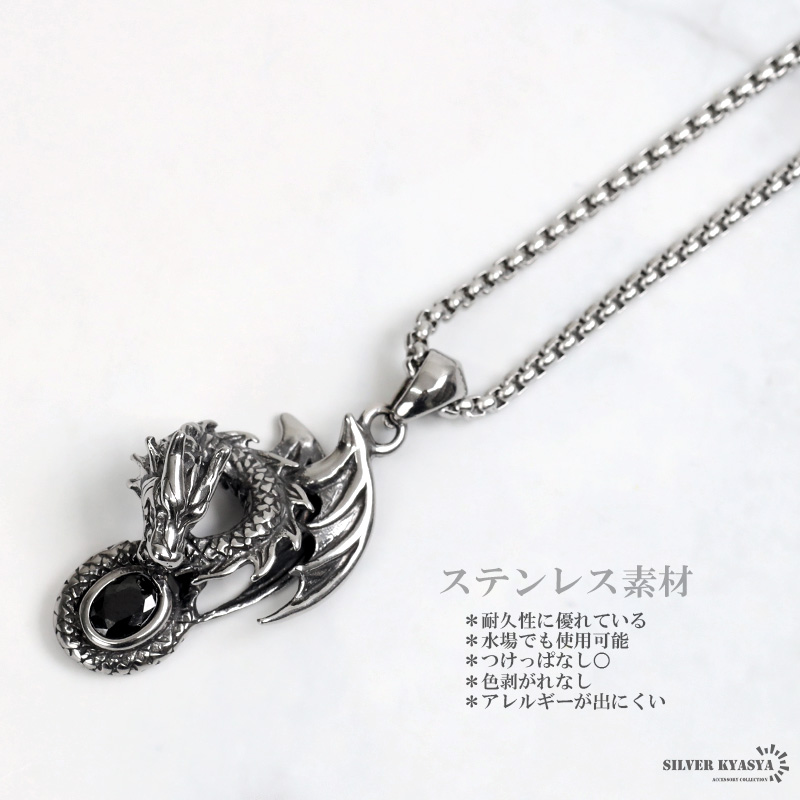 ステンレス ドラゴンネックレス シルバー 龍 ペンダントオニキス 竜 伝説 炎 メンズネックレス 渋い ベネチアンチェーン付き 爆買