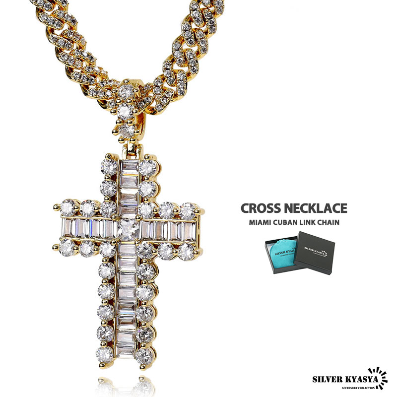 クロストップとマイアミキューバンチェーンをセットした存在感たっぷりのアイテム。大粒のキュービックジルコニア(CZ)が圧倒的な輝きをを放つ一品。