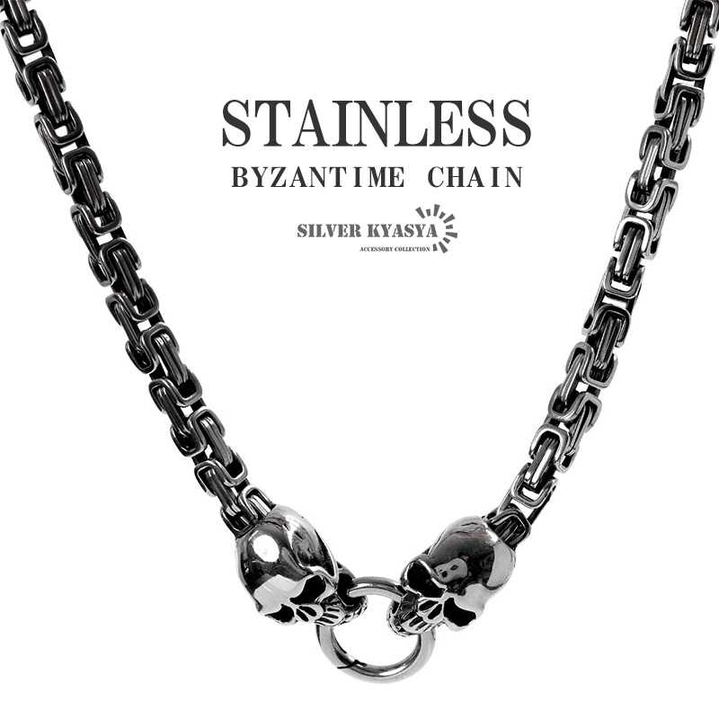 ステンレス ツインドクロネックレス ビザンチンチェーン シルバー ヘビー重め リアル 骸骨 ガイコツ ハード リング 大きめ