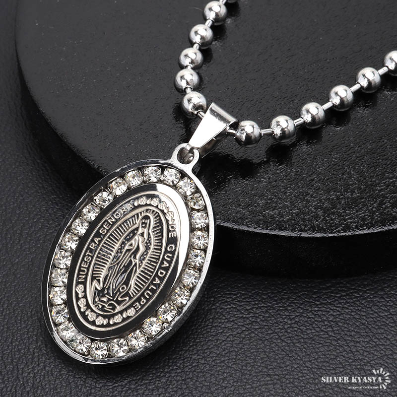 聖母マリアを描いたコイン「不思議のメダイ」をモチーフにしたネックレス。メダイの表面は鏡面仕上げのような光沢感があります。幅太めのボールチェーンとキラキラ輝くストーンが首元に存在感を与えてくれます。HIP HOPスタイルやB系ファッション、ストリート系にもおすすめ◎