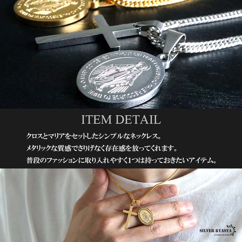 クロスとマリアをセットしたシンプルなネックレス。メタリックな質感でさりげなく存在感を放ってくれます。普段のファッションに取り入れやすく1つは持っておきたいアイテム。
