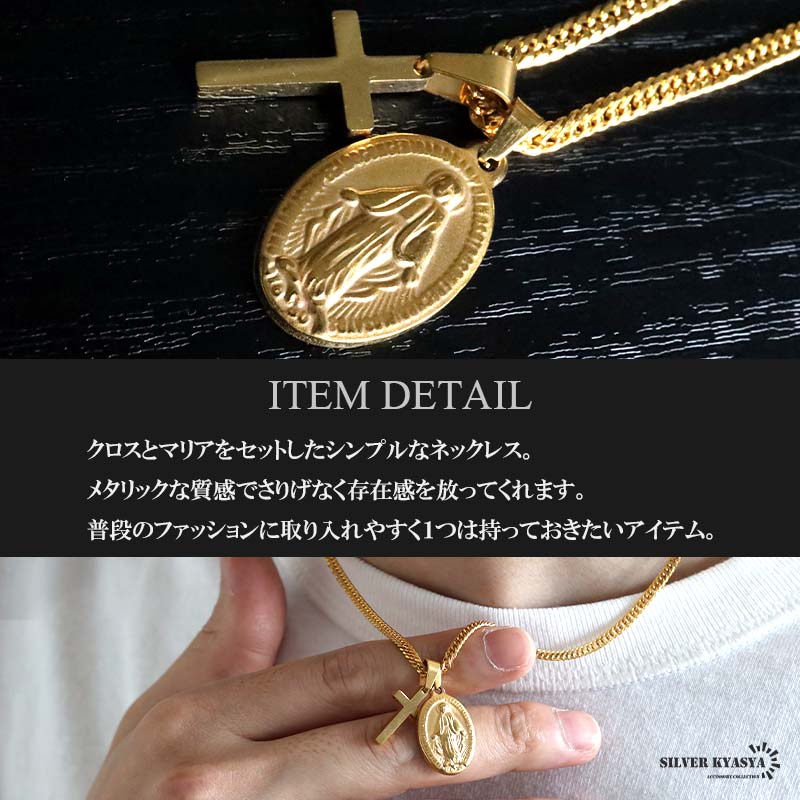 クロスとマリアをセットしたシンプルなネックレス。メタリックな質感でさりげなく存在感を放ってくれます。普段のファッションに取り入れやすく1つは持っておきたいアイテム。