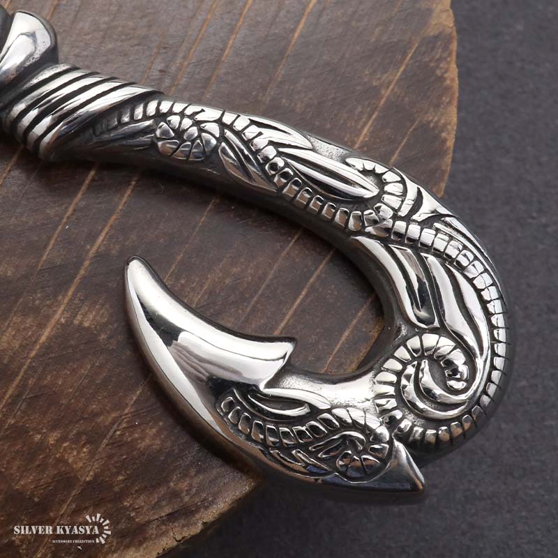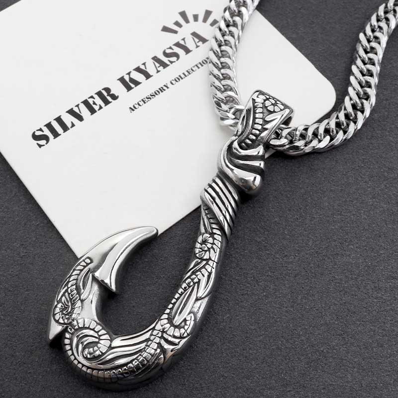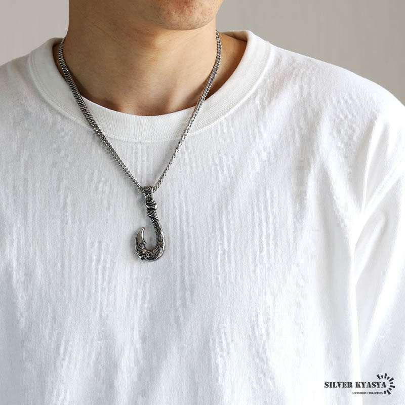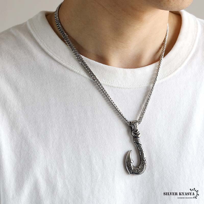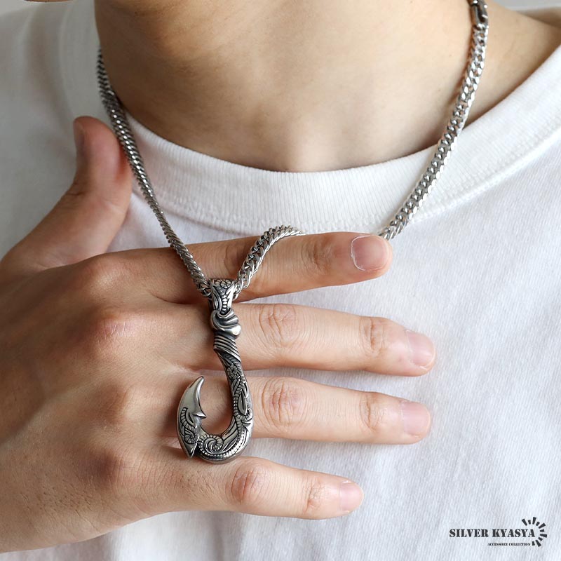 フィッシュフック(釣り針)をモチーフとした重厚感たっぷりのネックレス。トップにハワイの自然を感じられるスクロールとマイレをレリーフした逸品。単品でも十分に存在感があるのでアクセントにぴったり。