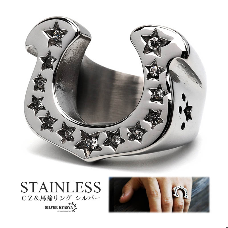 ステンレス ホースシューリング 馬蹄リング シルバー CZ スター 星 蹄 蹄鉄 幸運の象徴 ラッキーアイテム