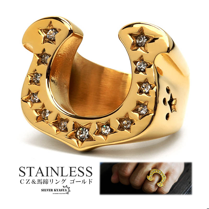 ステンレス ホースシューリング 馬蹄リング 18KGP ゴールド CZ スター 星 蹄 蹄鉄 幸運の象徴 ラッキーアイテム