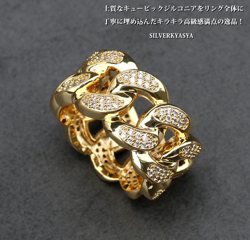 ゴールド 喜平チェーン リング 18k GP チェーン デザイン ジルコニア パヴェリング CZ hiphop ヒップホップ B系 存在感