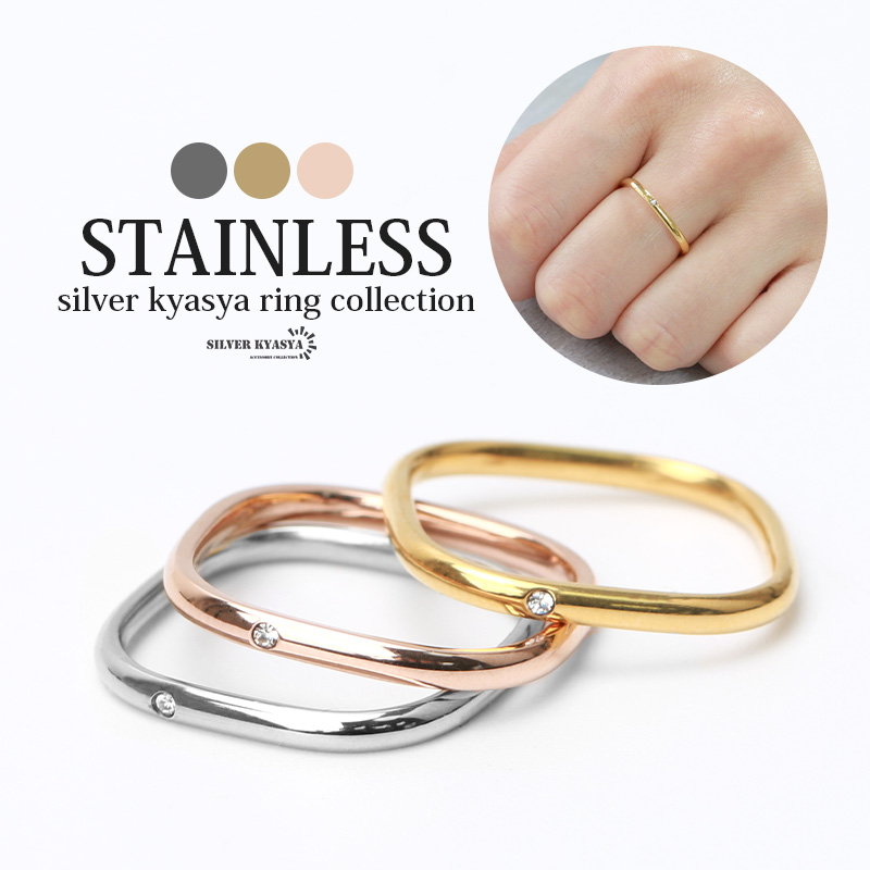 スクエアリング ステンレスリング キュービックジルコニア CZ シンプル 細身 シルバー ゴールド ローズゴールド 金属アレルギー対応