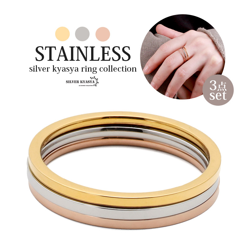 3点セット ステンレス リング レディース 指輪 セットリング 平打ちリング ゴールド シルバー ローズゴールド ピンクゴールド アレルギー対応 3連リング 三連