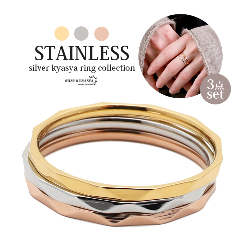 3点セット ステンレス リング レディース 指輪 セットリング ダイヤカット 極細 ゴールド シルバー ローズゴールド アレルギー対応 3連リング 三連
