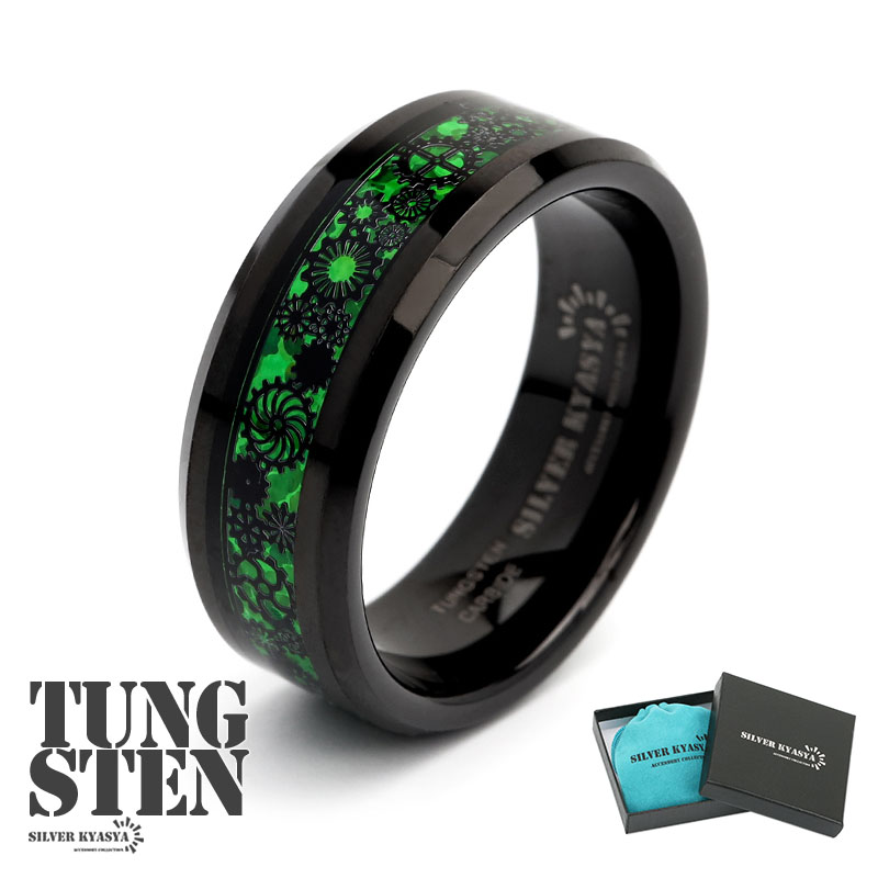 タングステン 歯車 リング メンズ 指輪 黒 グリーン 緑 ギア メタリック スマート 金属アレルギー対応 専用BOX オリジナル