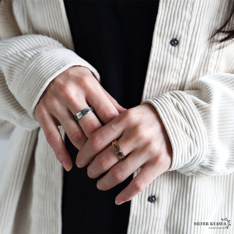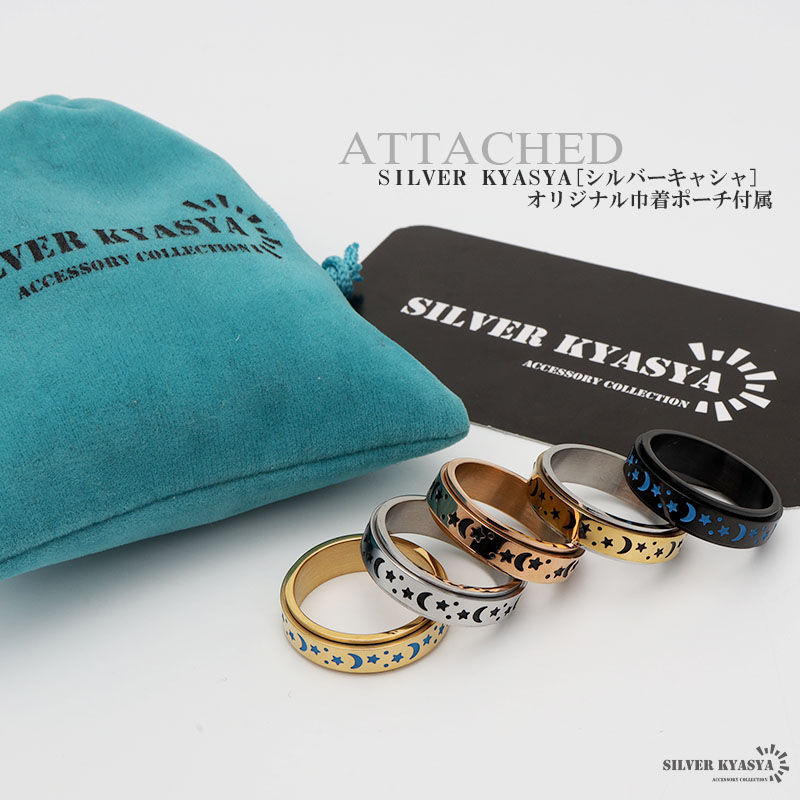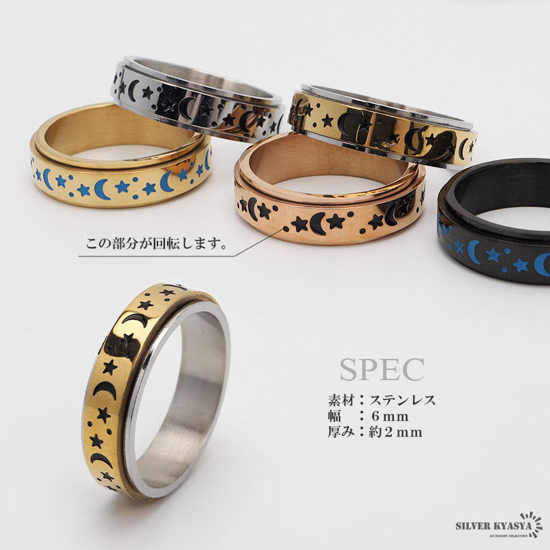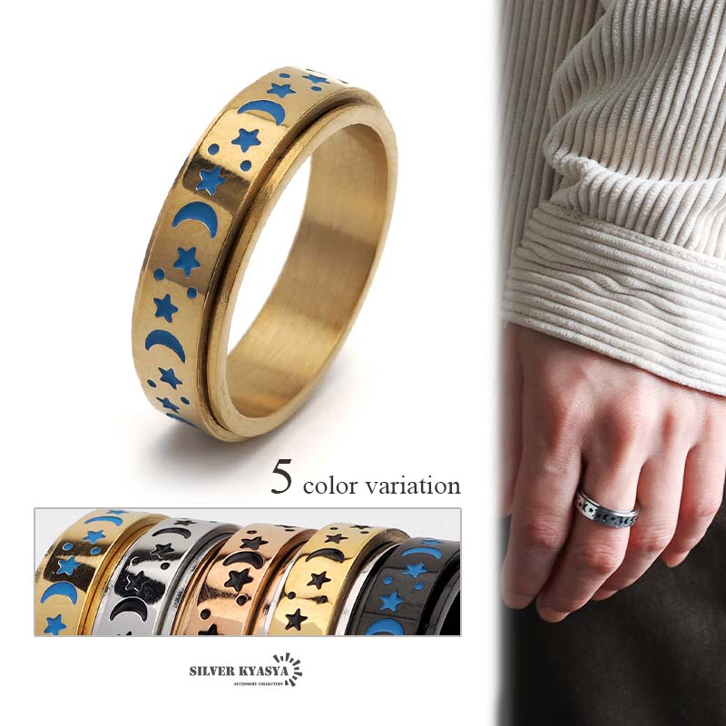 月と星 平打ちリング ステンレス 蓄光 夜光 レディース メンズ ギミックリング ゴールド シルバー ブラック 回る 回転 つけっぱなしOK 爆買