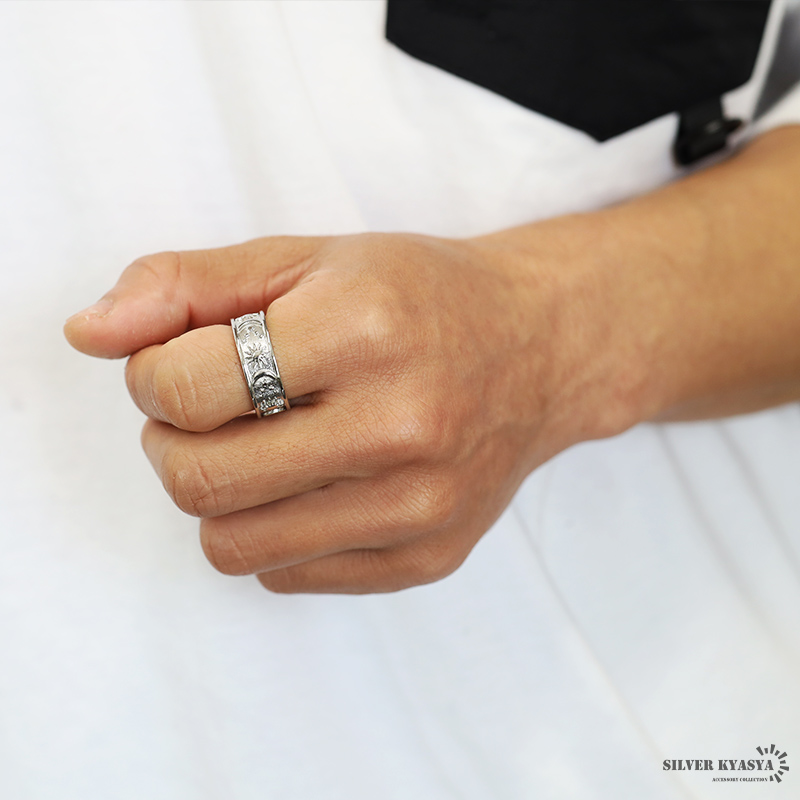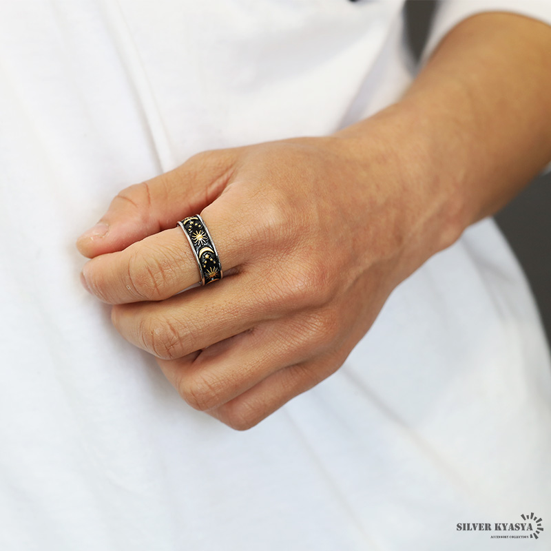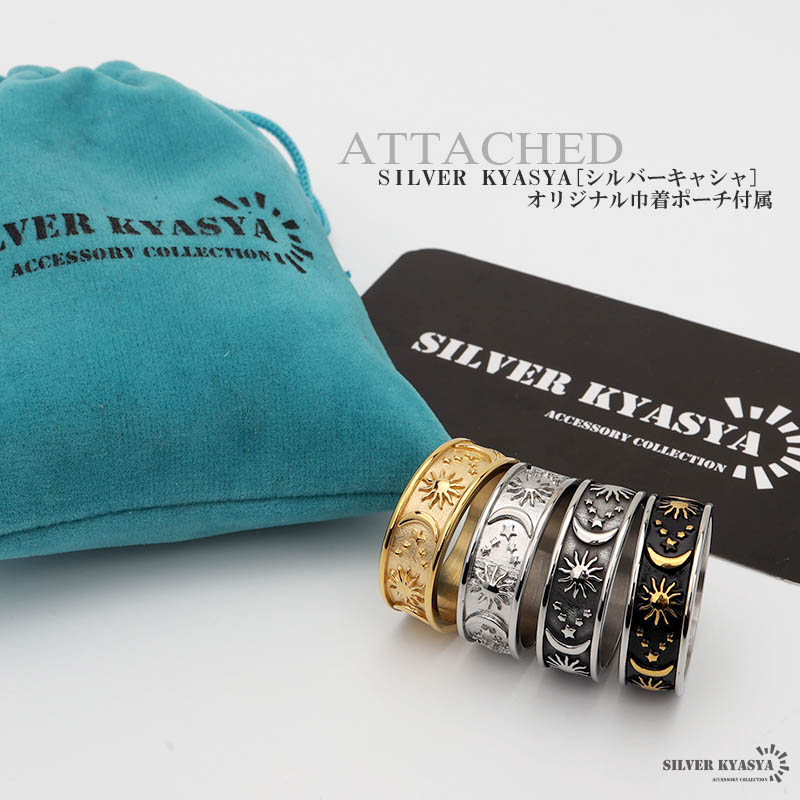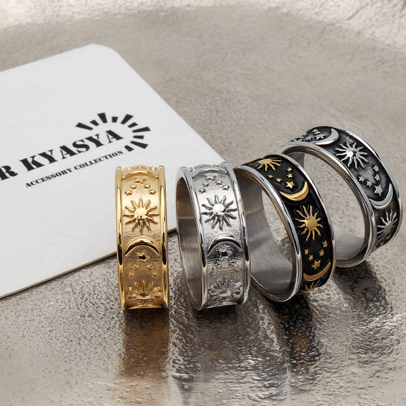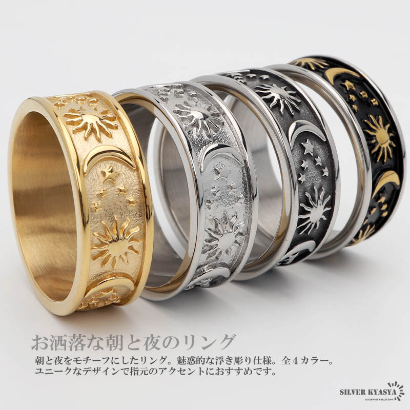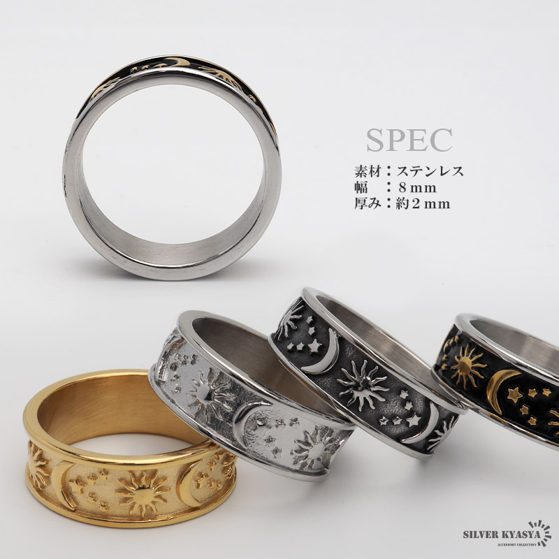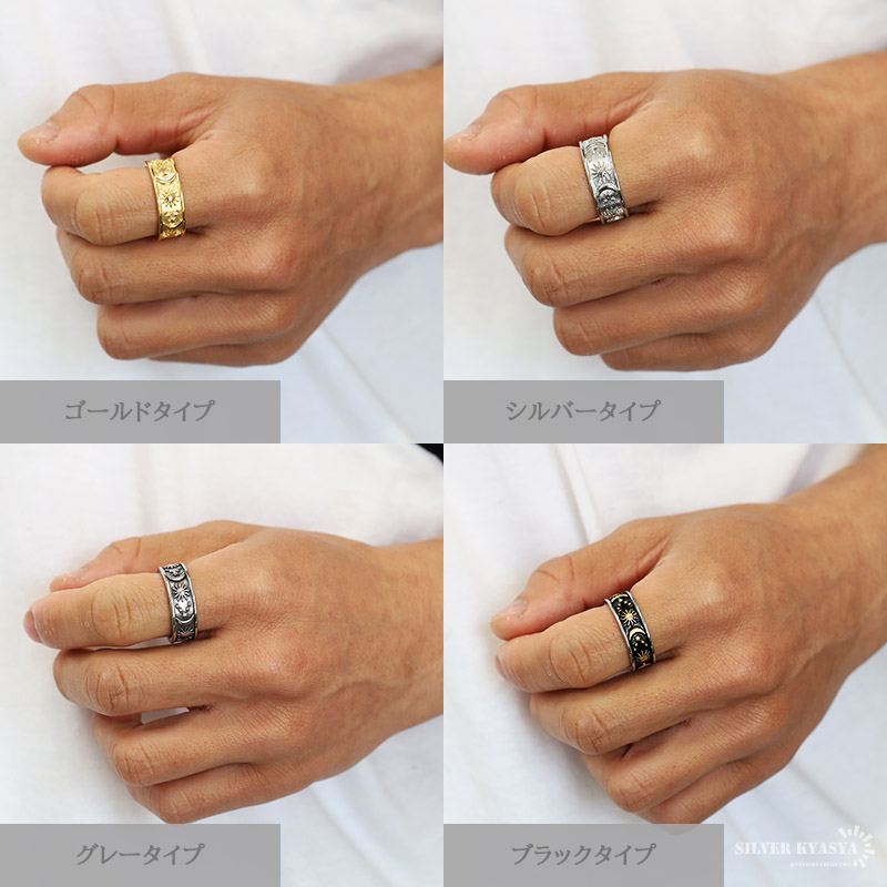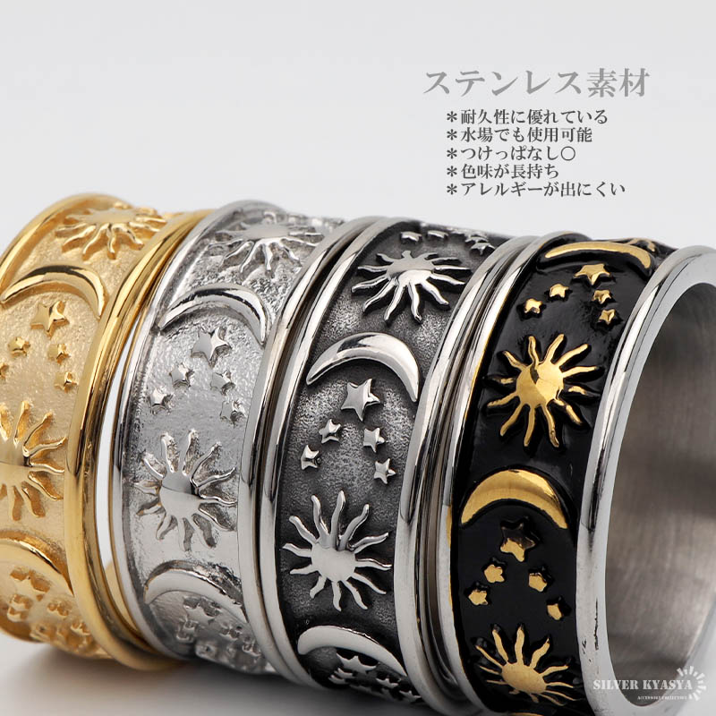 ワイドリング ステンレス メンズ レディース ボヘミアンリング ゴールド シルバー ブラック 浮き彫り 太陽 月 つけっぱなしOK 爆買
