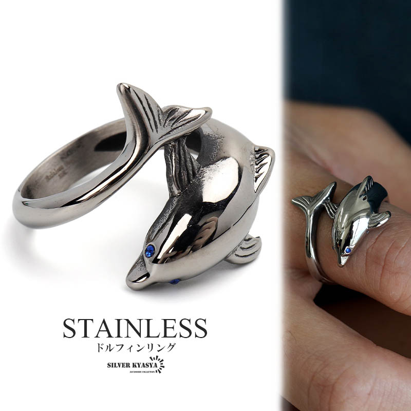 安心ステンレス製 イルカリング 指に巻きつく 指輪 イルカ ハワイアンリング 可愛い 表情 ドルフィンリング シルバー メンズリング 遊び心