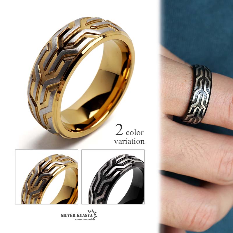 メンズリング かっこいい ゴールド ブラック 男性 指輪 シンプルリング 付けっぱなしOK ステンレス製 タイヤ模様デザイン