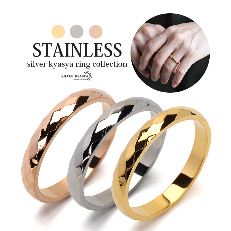 ステンレス素材 ダイヤカットリング 甲丸リング キルティング シルバー ゴールド ローズゴールド 指輪 重ね付け ピンキーリング ファランジリング 金アレ