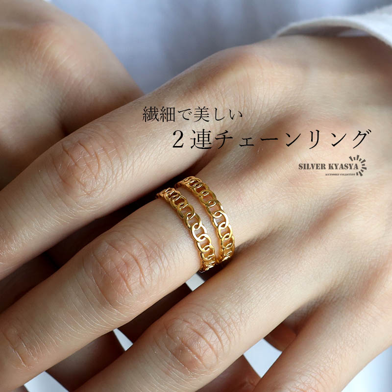 コマのまるい2連のチェーンモチーフリング。透かしがあるため軽やかですっきりとした雰囲気を楽しめます。個性的でアクセントに最適のアイテム。