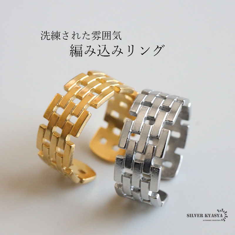 編み込みリング メッシュ ゴールドリング 指輪 18KGP ゴールド シルバー ステンレス ワイドリング 幅広 透け感 レディース フリーサイズ 金属アレルギー対応