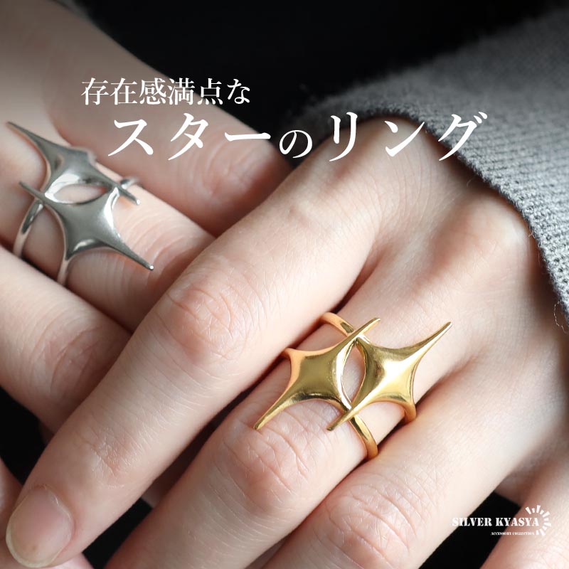 ステンレス スターリング 星 大ぶり ダイヤリング キラキラ ゴールド 18K GP シルバー フリーサイズ レディース 女性 指輪 金属アレルギー対応