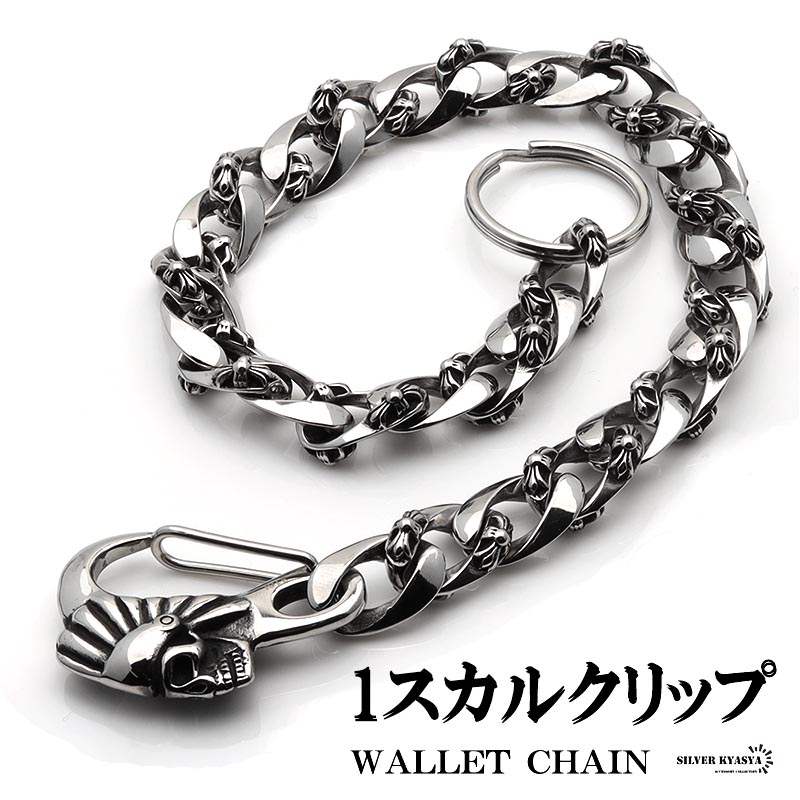 316L ステンレス インディアン スカル 髑髏 1クリップ ウォレットチェーン シルバー クロスチェーン 重厚 ハンドメイド