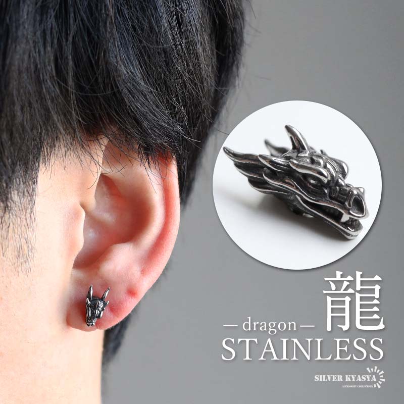 ステンレス ドラゴンピアス 龍 スタッドピアス ワンポイント シルバー 燻し 個性的 片耳 メンズ 男性 金アレ対応