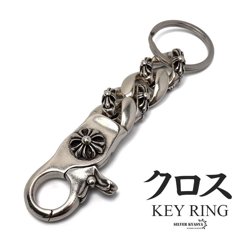クロスキーリング キーチェーン 喜平チェーン キーホルダー キーフック クリップ 十字架 重厚 燻し風加工 アンティーク 鍵 小物