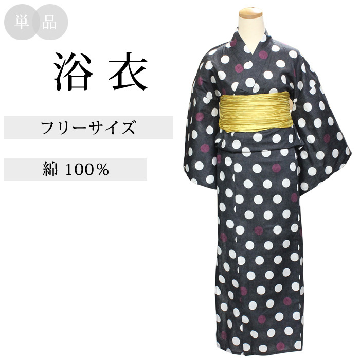 レディース 女性 浴衣 黒系 水玉 ドット 綿100% 単品 御仕立て上がり