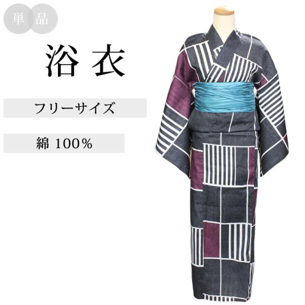 レディース 女性 浴衣 黒系 格子縞 綿100% 単品 御仕立て上がり