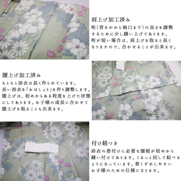 【100サイズ・11】ナチュラル系 女児浴衣 リーフ・グリーン 100cm 肩上げ済み・腰上げ済み・付け紐付き 綿100%