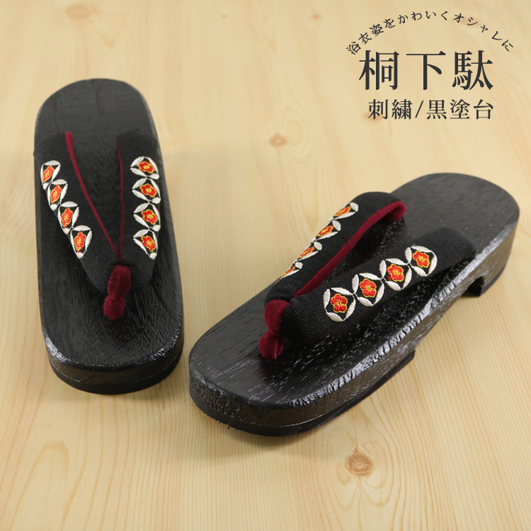刺繍入り 桐下駄 [BK05] 黒台 鼻緒 黒 ブラック 桐 下駄 ゆかた下駄 刺繍 ちりめん 縮緬 浴衣 ゆかた レディース フリーサイズ 婦人下駄