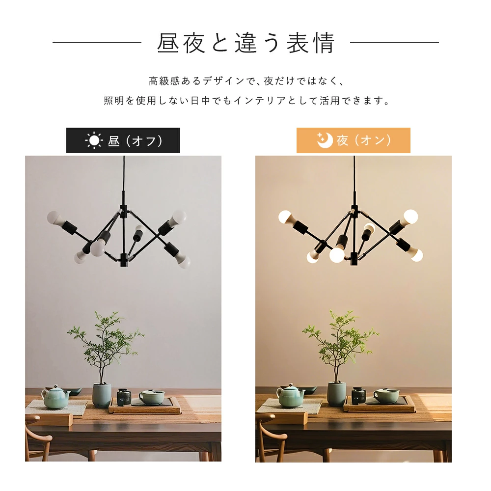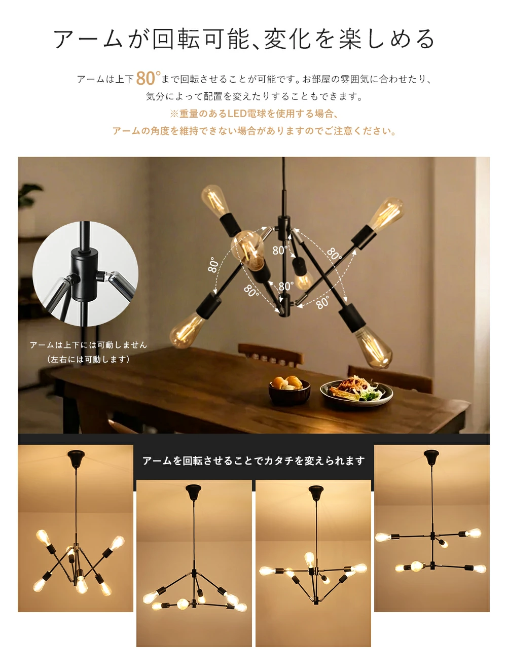 ●【角度自由に調節可能】:6本のアームはそれぞれ上下方向に約80°に調節することができます。角度によって印象が変わるので、水平に揃えたり、交差させて立体感を出したりと自分だけのお気に入りの空間を作ることができます。メイン照明にも、間接照明にも、これ一台で使い分けできる。