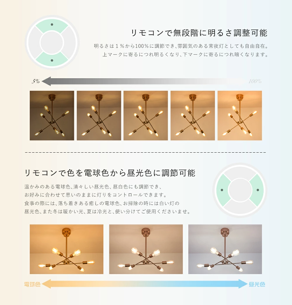 ●【LED電球対応】:口金E26のLED電球・ハロゲン・フィラメント・電球型の蛍光灯使用可能。調光調色リモコン電球と組み合わせたら、リビングでリラックスしている時やダイニングで食事する時は温かみのある色を。読書や勉強する時は集中できる白い光に切り替えて使えます。