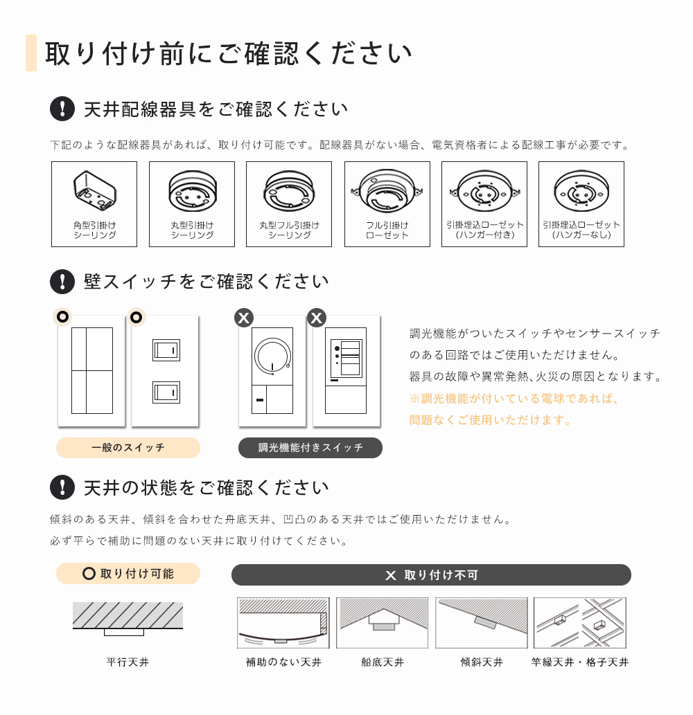 ※傾斜のある天井、傾斜を合わせた舟底天井、凹凸のある天井ではご使用いただけません。※必ず平らな天井に取り付けて下さい。