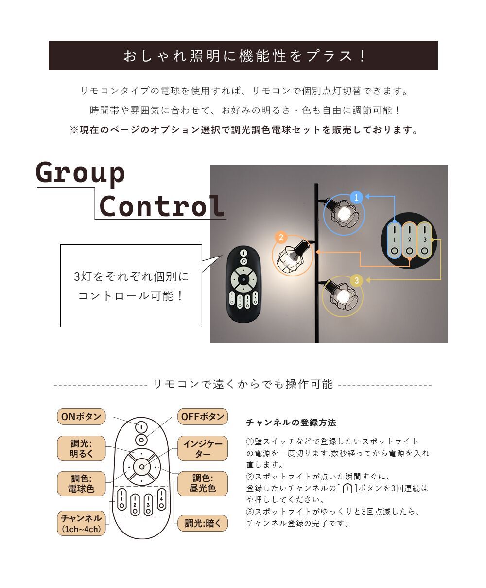 ※本体には調光調色機能は搭載されておりません。調光調色機能をご利用の方はリモコン式電球付きオプションをご購入ください。