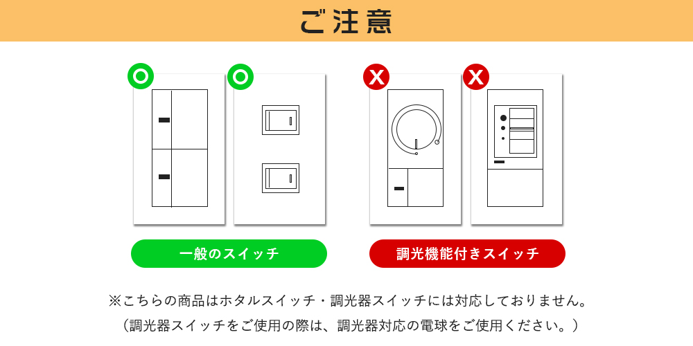 ※ほたるスイッチでの使用不可(ほたるスイッチには微弱電流が絶えず流れており、消灯時にLEDシャンデリア球が微弱電流を受けて点滅する現象が起きる場合がございます。)