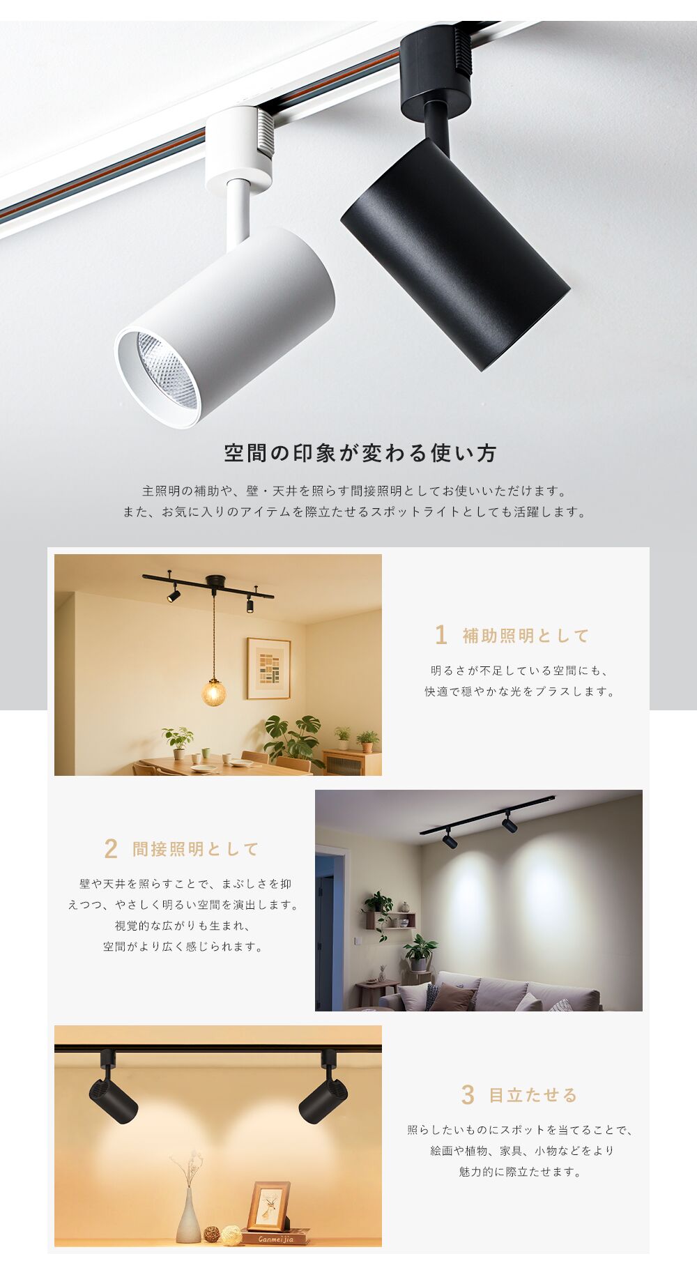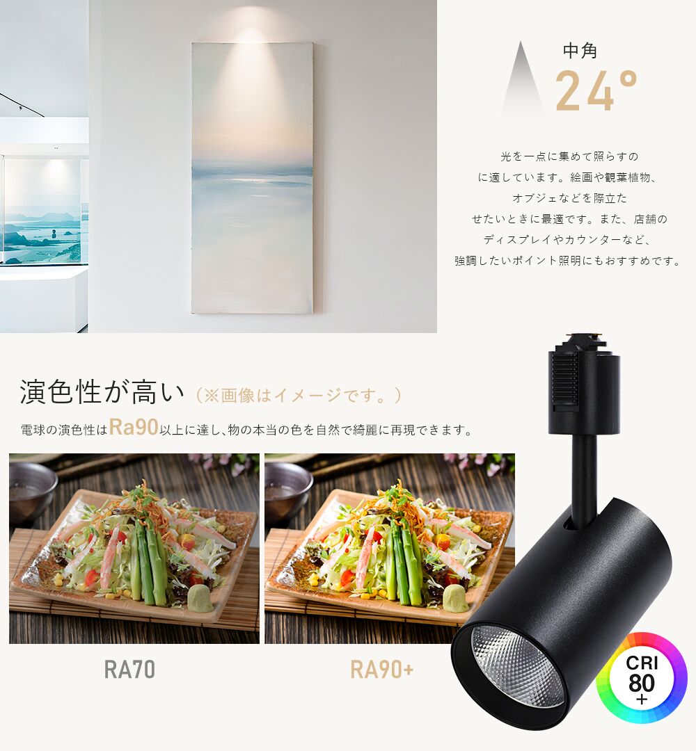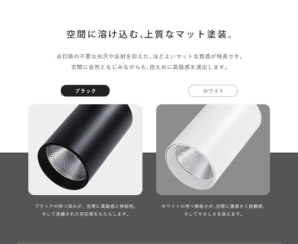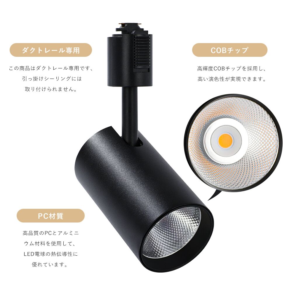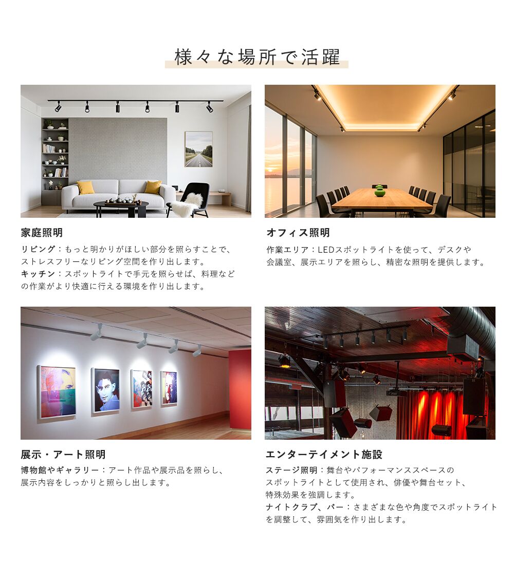●【ダクトレール専用】:配線ダクトレールやライティングレールに簡単に取り付け可能です。高天井や吹き抜けなどの空間に使いやすく、また壁面や絵のライトアップなどにもおすすめです。