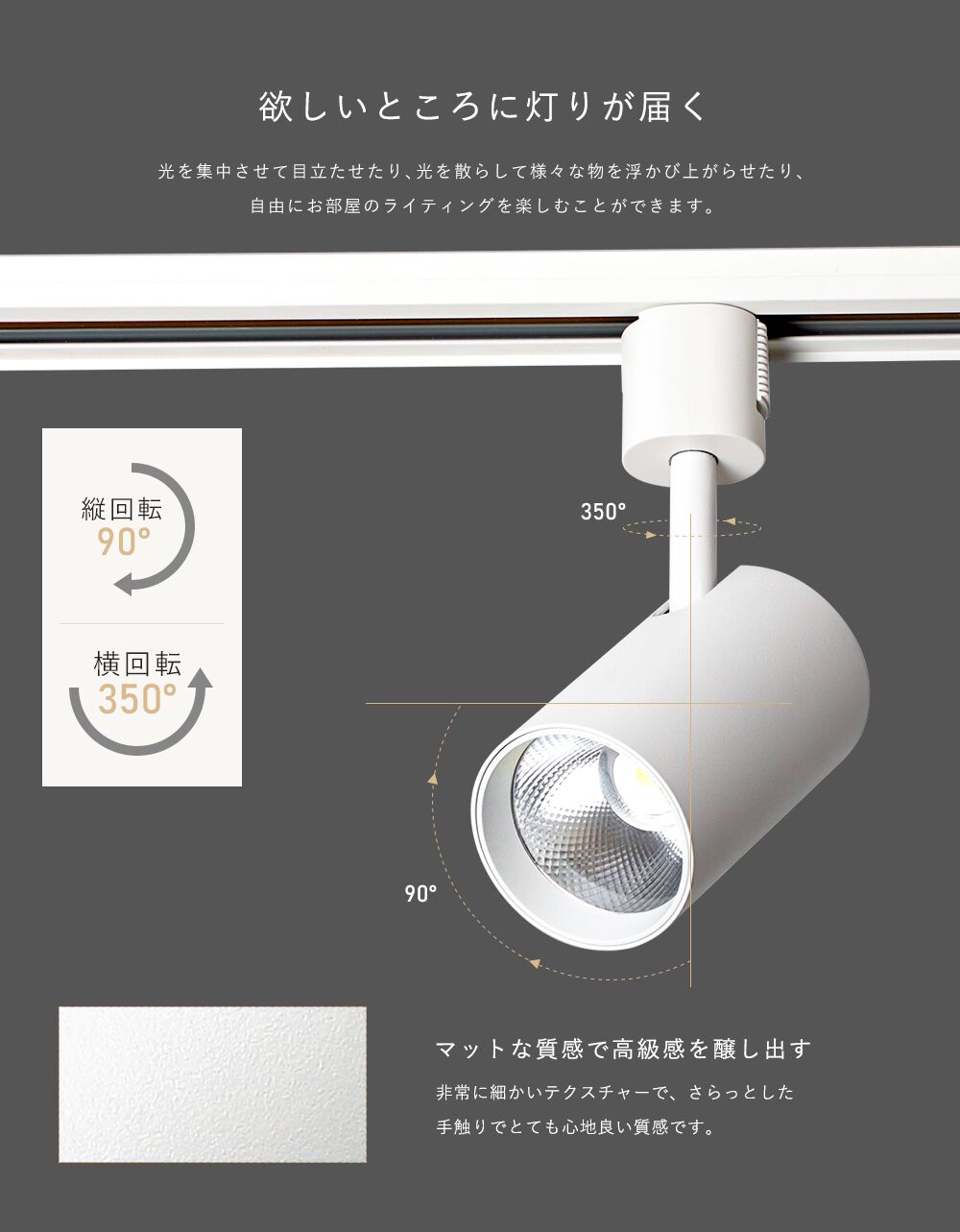 ●【照射角度自由】:ライトの向きを上下90度回転350度までお好きに調節でき、理想的な空間を演出できます。
