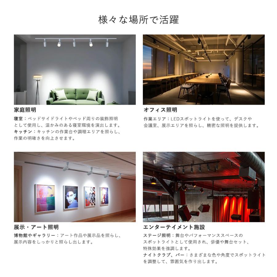 ●【ダクトレール専用】:配線ダクトレールやライティングレールに簡単に取り付け可能です。高天井や吹き抜けなどの空間に使いやすく、また壁面や絵のライトアップなどにもおすすめです。