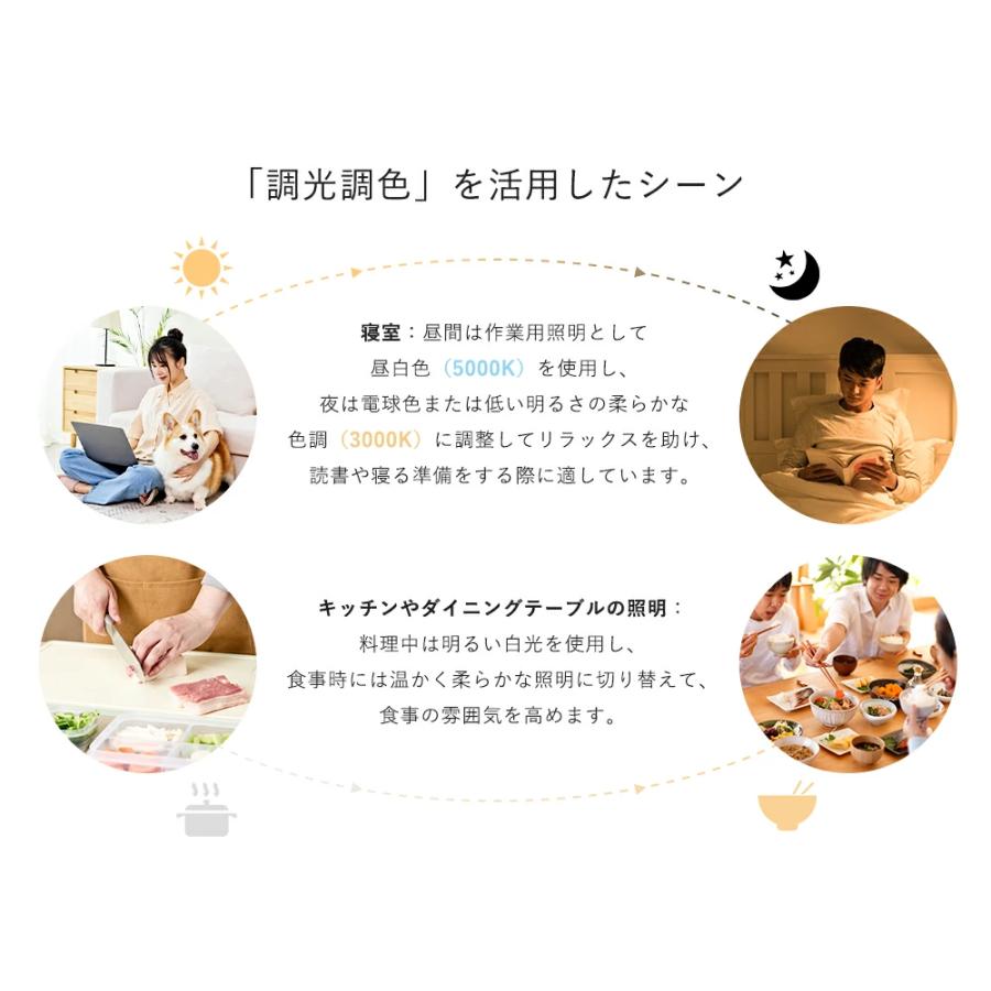 ●【無段階調光調色機能付き】:光色と明るさを細かく調節可能なLEDリモコン電球内蔵、より自分好みの空間作りを実現できます。専用リモコンで、明るさボタンを長押すと簡単に明るさ5%~100%に連続調節ができます。色あいボタンを長押すと電球色2700K〜昼光色6500Kに連続調節できます。