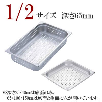■サイズ:1/2サイズ(外形寸法327×265)■深さ:65mm■板厚:0.8mm■容量:3.8L■材質:18Cr-5Ni-8Mn-N※底面と側面に穴があいています。